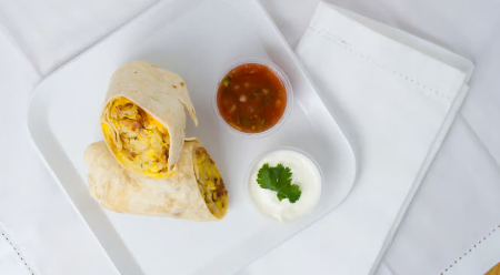 Scrambled Eggs, Hash Browns, Bacon, American And Pepper Jack Cheese Served With Salsa And Sour Cream.