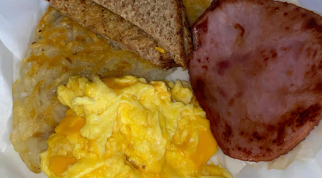 Two Eggs, Hash Browns, Breakfast Meat, Toast.
