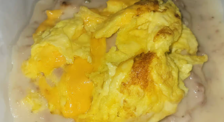 Two Buttermilk Biscuits, Home Made Pork Or Turkey Sausage Gravy, Two Eggs On The Top Of Gravy..