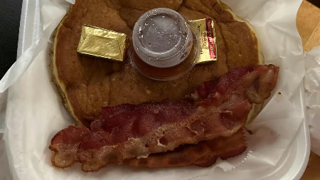 Two Eggs, One Giant Pancake, Hash Browns, Two Slices Bacon, Two Turkey Sausage, Toast .