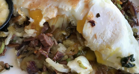House Made Corned Beef, Potatoes, Onions, Carrots, Two Eggs, Toast.