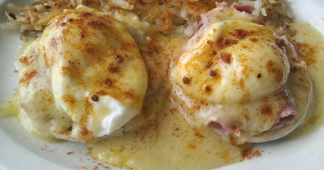 Two Poached Eggs, Ham, Hollandaise, English Muffin, Hash Browns.